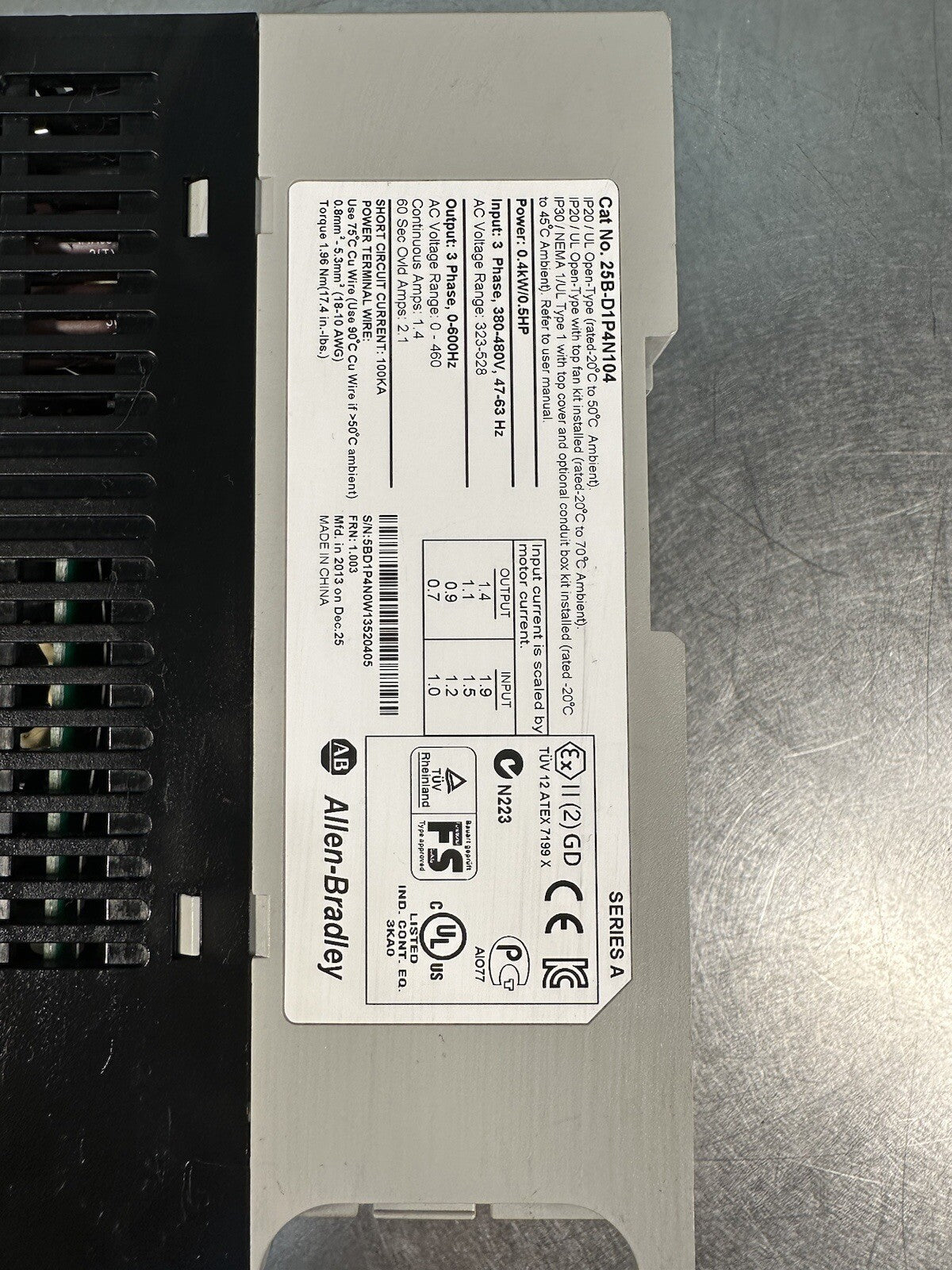 Allen Bradley 25B-D1P4N104 Ser A PowerFlex 525 AC Drive 480V 1.4A 0.4kW