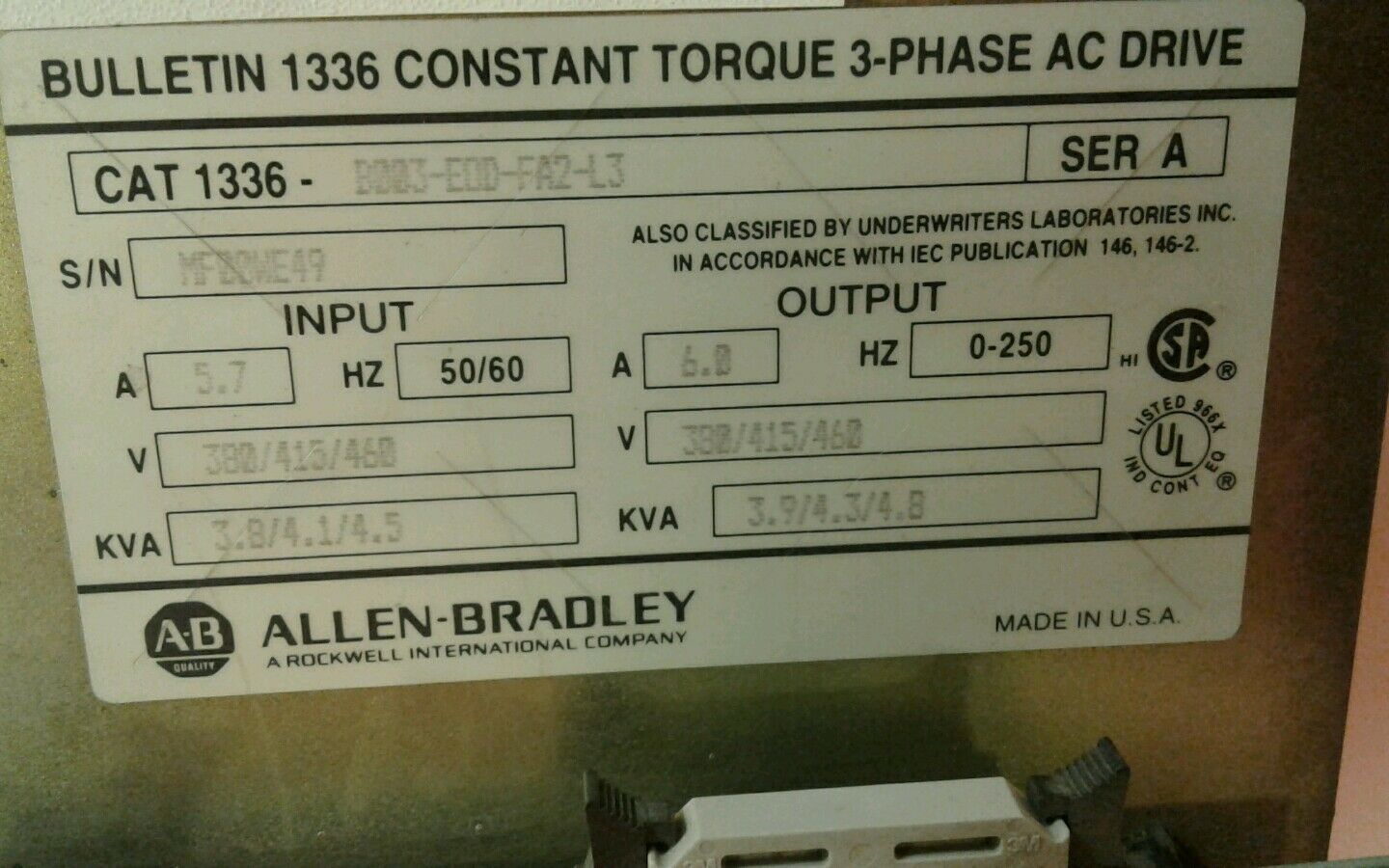 ALLEN-BRADLEY 1336-B003-EOD-FA2-L3 Ser A CONSTANT TORQUE 3 PHASE AC DRIVE. 3B