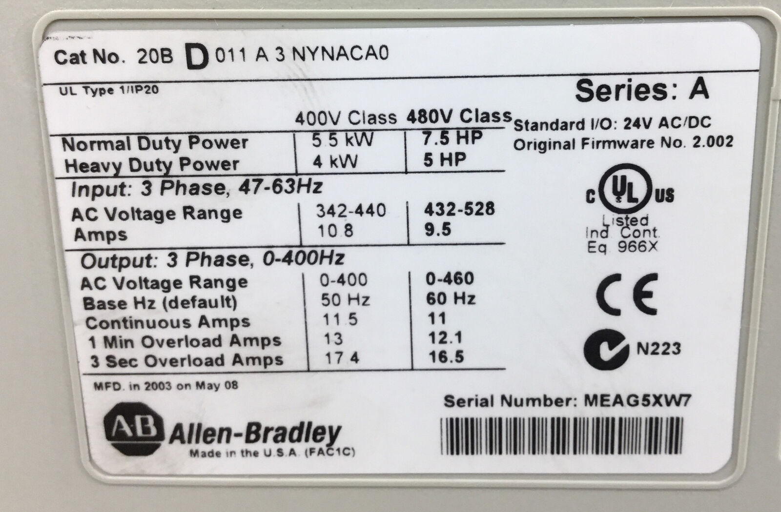 ALLEN BRADLEY 20BD011A3NYNACA0 /A PowerFlex 700 3Ph 480V 0-400Hz 7.5HP 1C