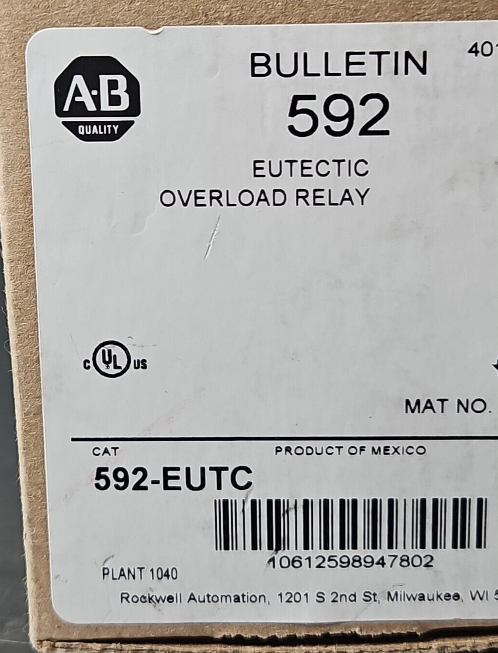 Allen Bradley 592-EUTC Eutectic Overload Relay.