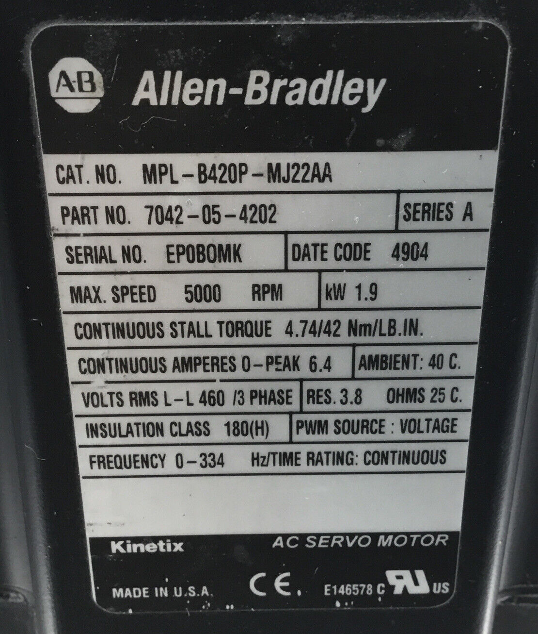 ALLEN BRADLEY MPL-B420P-MJ22AA /A AC Servo Motor 5000RPM Max 1.9 kW 1F