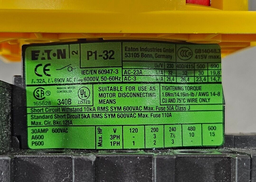 EATON P1-32 DISCONNECT SWITCH with HI11-P1/P3/E SPX-HI11-P1-P3E. Loc 4E-16