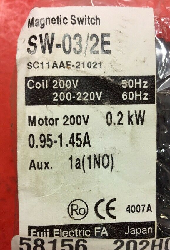 FUJI ELECTRIC SW-03/2E MAGNETIC SWITCH COIL 200V 200-220V 0.2KW 0.95-1.45A 4A