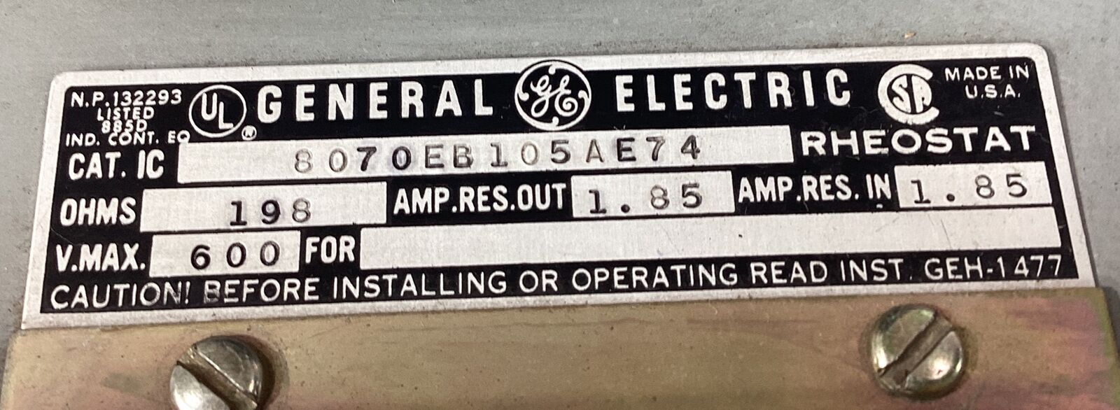 General Electric Rheostat, 600 Volt, Cat.# 8070EB105AE74 198 Ohms 4B