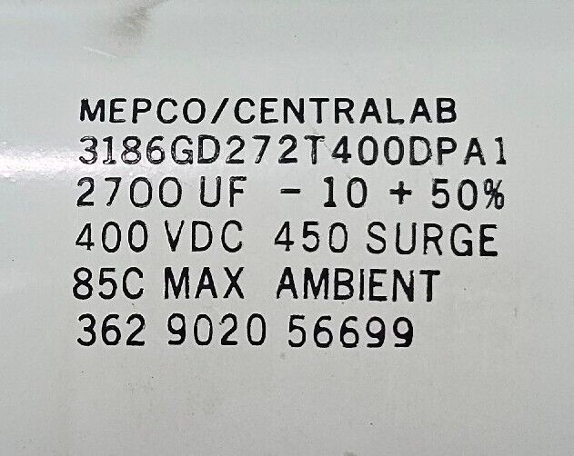 Mepco/Centralab 3186GD272T400DPA1 Capacitor 2700 UF 400VDC 36 2 9008 56699. Loc 4A-27